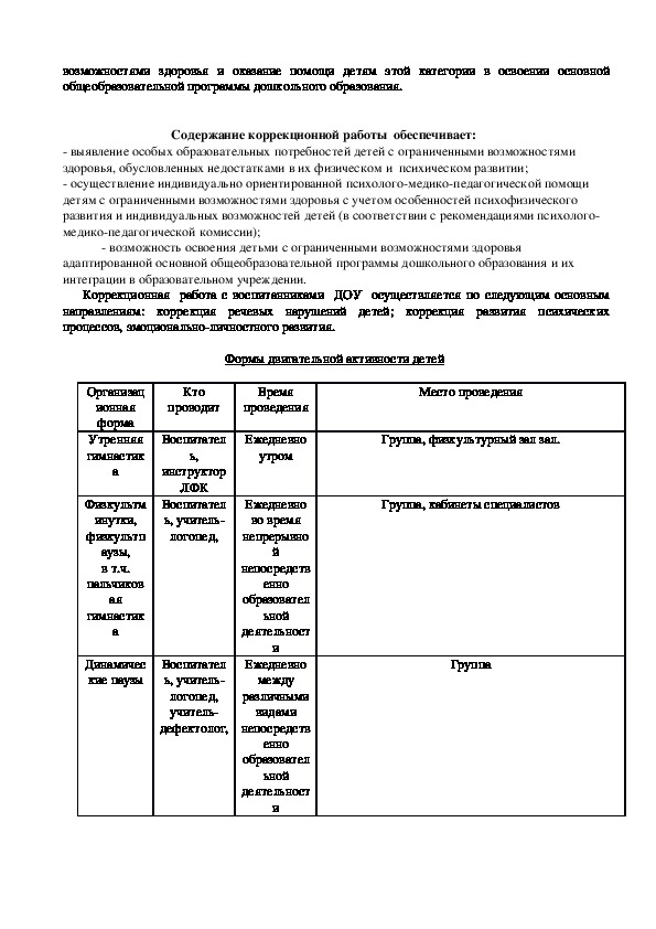 Коррекционная деятельность включает логопедическую работу, работу по коррекции