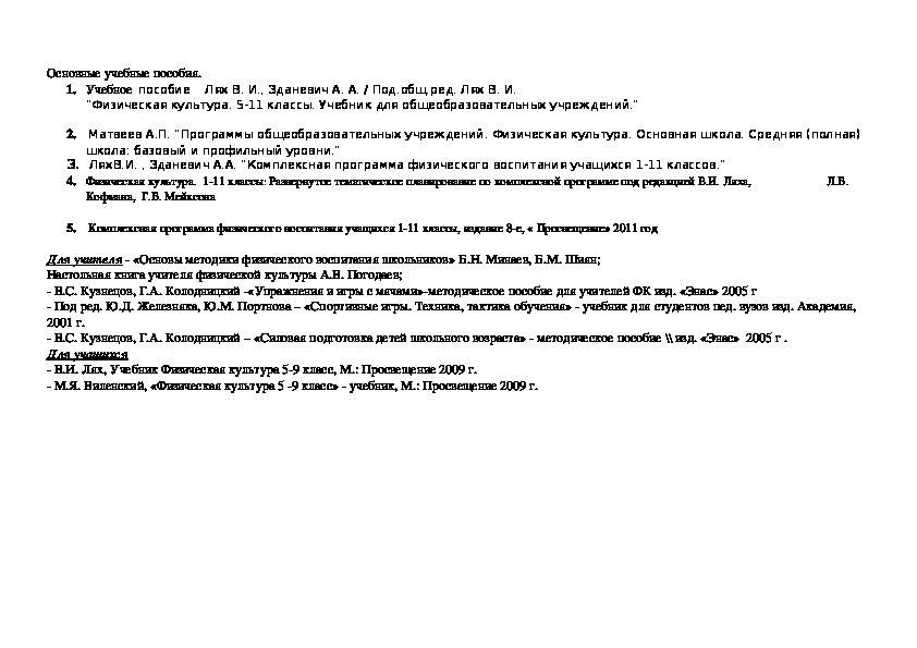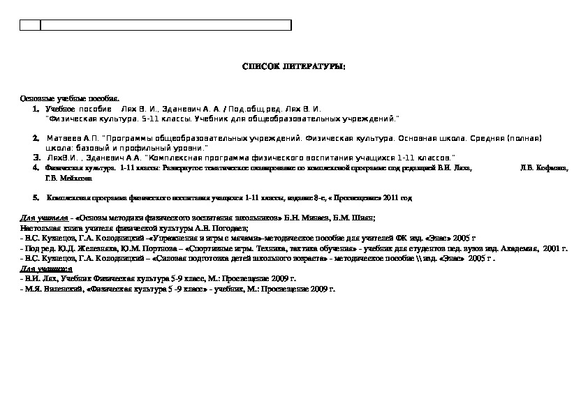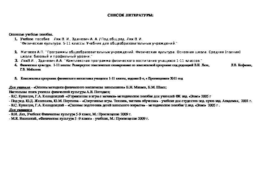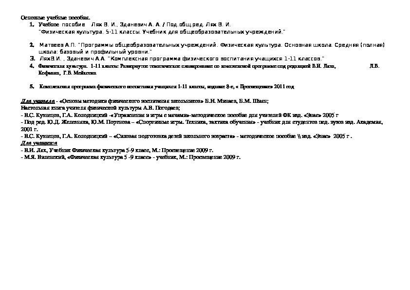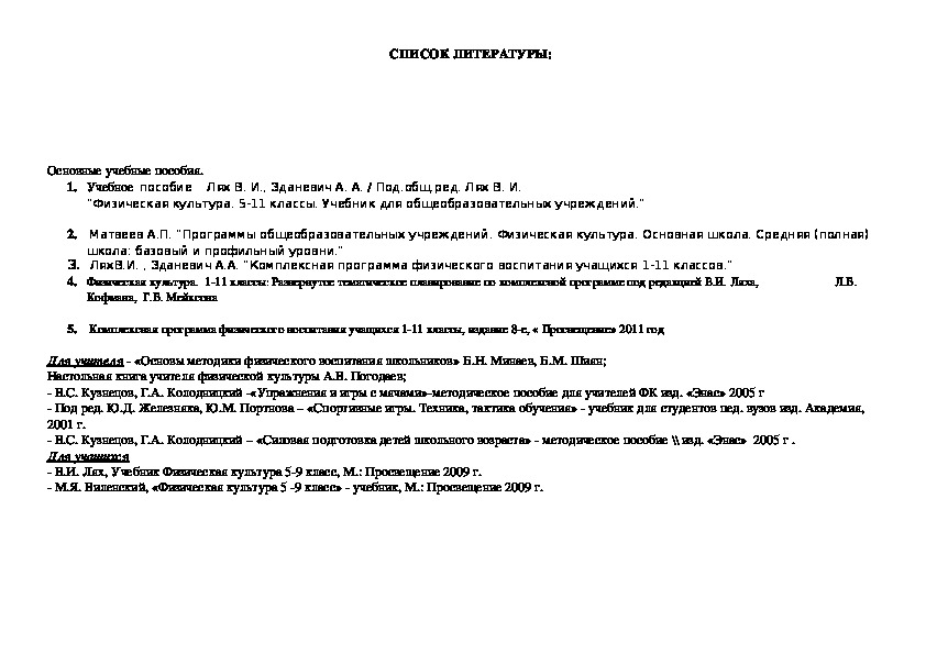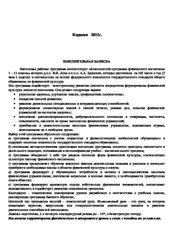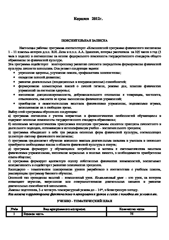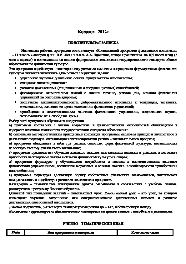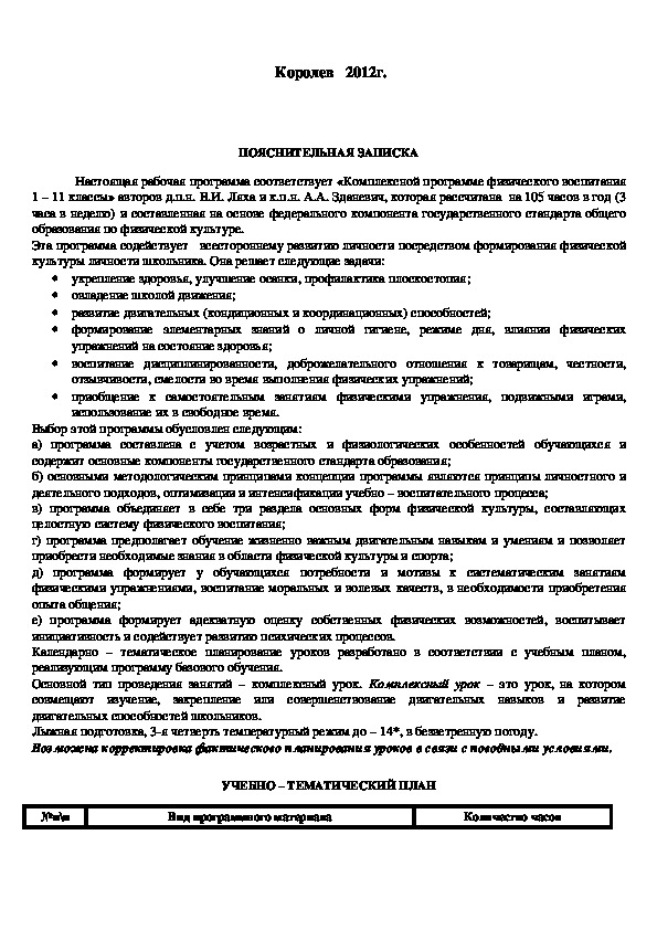 Настоящая рабочая программа соответствует «Комплексной программе физического воспитания 1 – 11 классы» авторов д.п.н. В.И. Ляха и к.п.н. А.А. Зданевич, которая рассчитана на 105 часов в год (3 часа в неделю) и составленная на основе федерального компонента государственного стандарта общего образования по физической культуре.