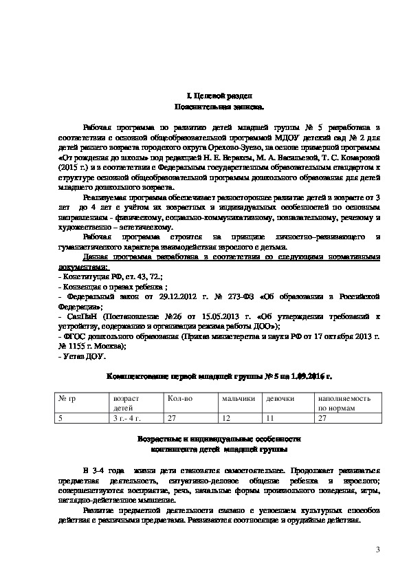 Реализуемая программа обеспечивает разностороннее развитие детей в возрасте от 3 лет до 4 лет с учётом их возрастных и индивидуальных особенностей по основным направлениям - физическому, социально-коммуникативному, познавательному, речевому и художественно – эстетическому. Рабочая программа строится на принципе личностно–развивающего и гуманистического характера взаимодействия взрослого с детьми.