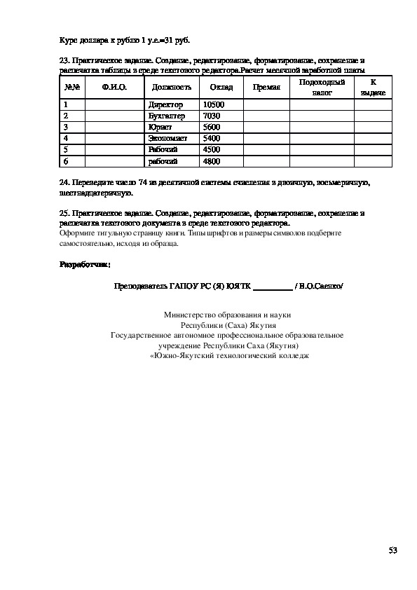 Разработчик: Саенко Вера Олеговна, преподаватель ГАПОУ РС (Я) «ЮЯТК»