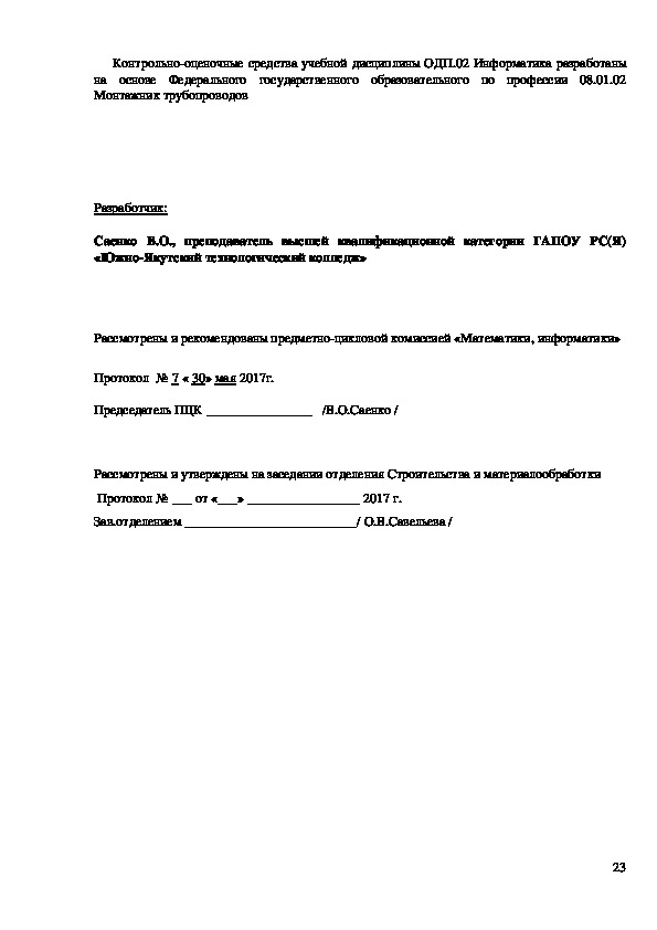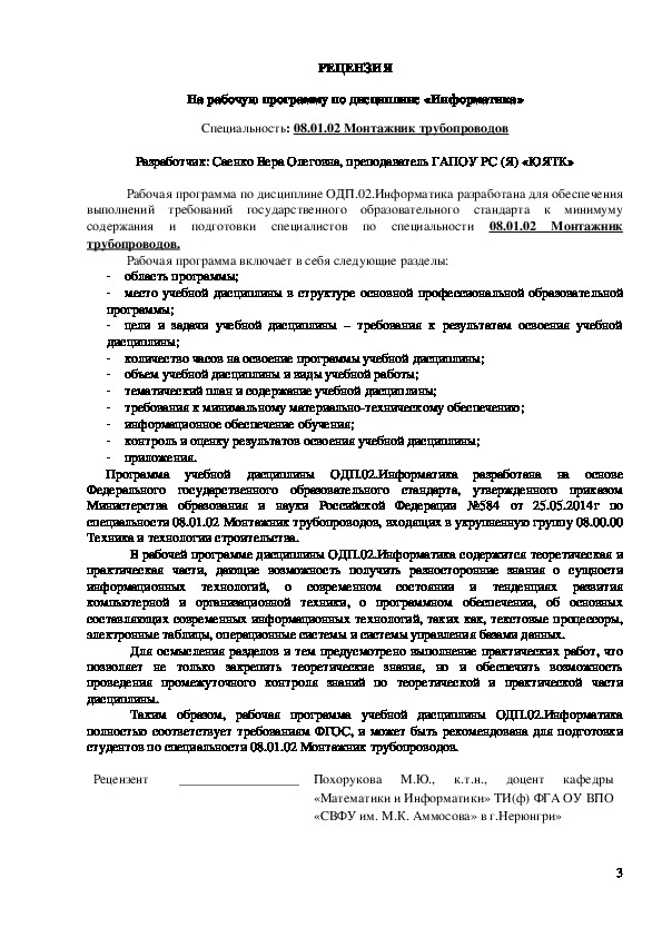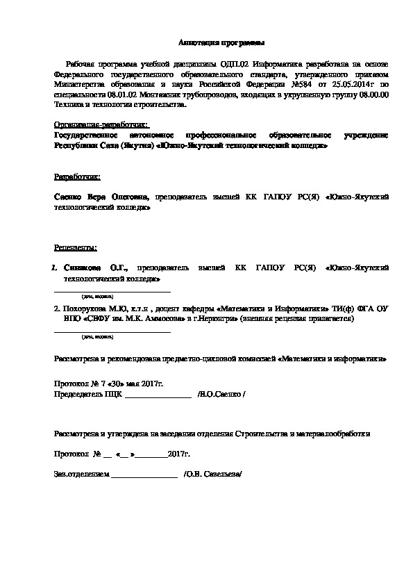 приложения.Рабочая программа по дисциплине ОДП.02.Информатика разработана для обеспечения выполнений требований государственного образовательного стандарта к минимуму содержания и подготовки специалистов по специальности 08.01.02 Монтажник трубопроводов.