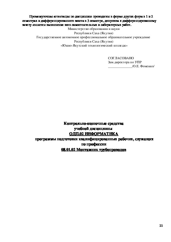 Рабочая программа по дисциплине ОДП.02.Информатика разработана для обеспечения выполнения требований государственного образовательного стандарта к минимуму со-держания и подготовки специалистов по специальности 08.01.02 Монтажник трубопроводов.