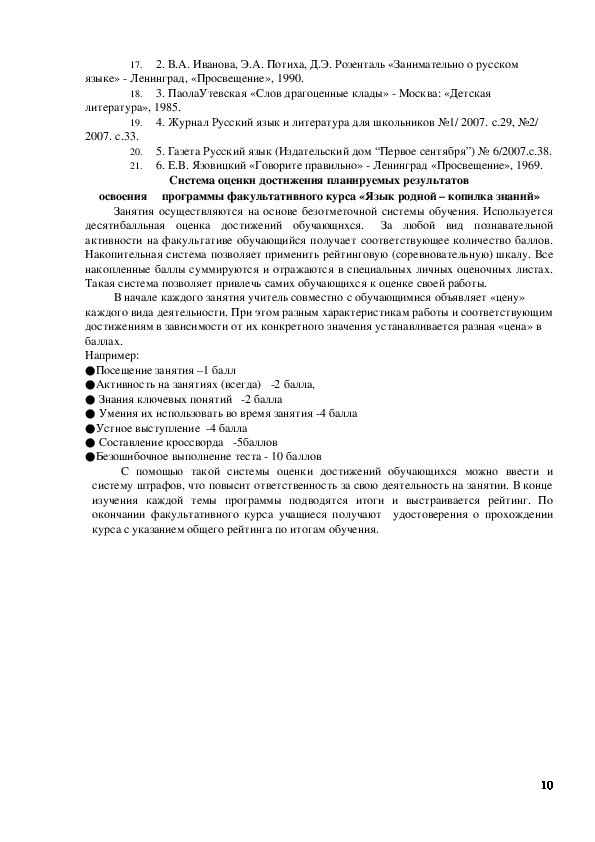 освоения программы факультативного курса «Язык родной – копилка знаний»