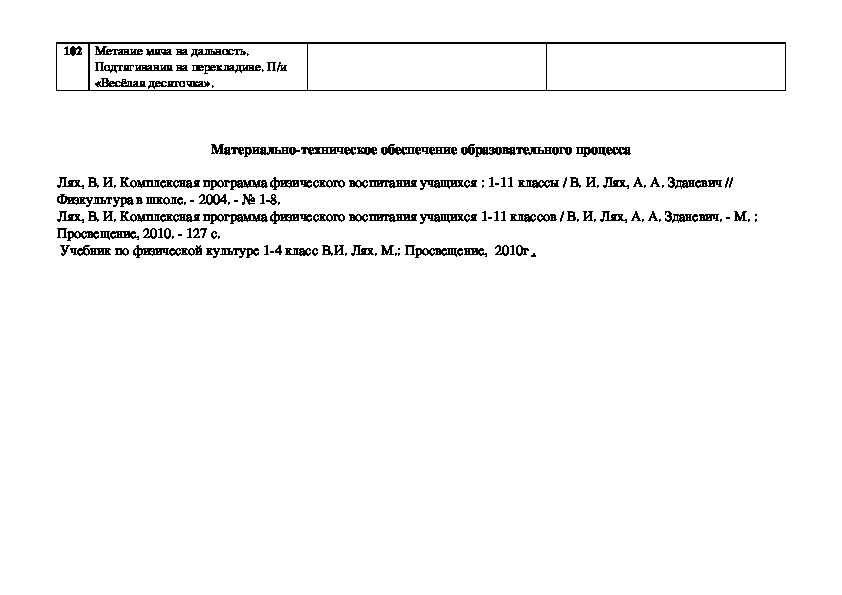 Согласно базисному (образовательному) плану образовательных учреждений РФ на изучение физической культуры 102 (3 ч в неделю, 34