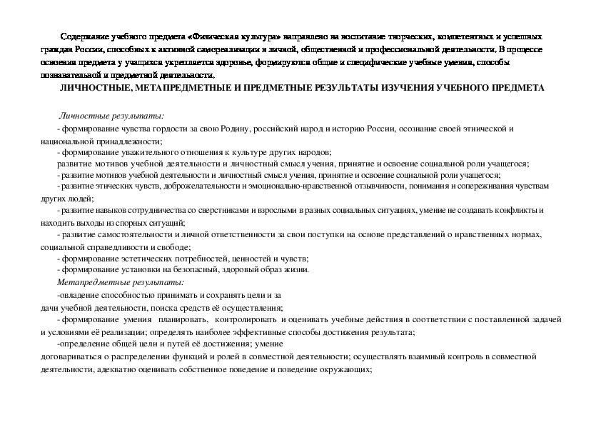 сверстниками и взрослыми людьми.Содержание учебного предмета «Физическая культура» направлено на воспитание творческих, компетентных и успешных