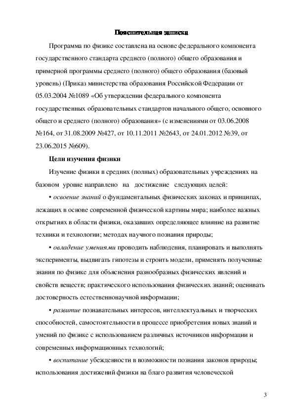 Программа по физике составлена на основе федерального компонента государственного стандарта среднего (полного) общего образования и примерной программы среднего (полного) общего образования (базовый уровень) (Приказ министерства образования Российской Федерации от 05.03.2004 №1089 «Об утверждении федерального компонента государственных образовательных стандартов начального общего, основного общего и среднего (полного) образования» (с изменениями от 03.06.2008 №164, от 31.08.2009 №427, от 10.11.2011 №2643, от 24.01.2012 №39, от 23.06.2015 №609).