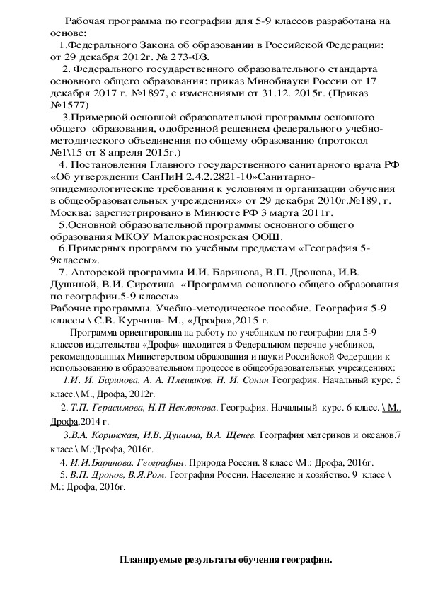 Рабочая программа по географии для 5-9 классов по авторам классической линии. Содержит 3 раздела,которые требуются по приказу Минобнауки России от 17 декабря 2017 г. №1897, с изменениями от 31.12. 2015г. (Приказ №1577) . Добавлен раздел "Пояснительная записка".Адресован учителям географии общеобразовательных школ.