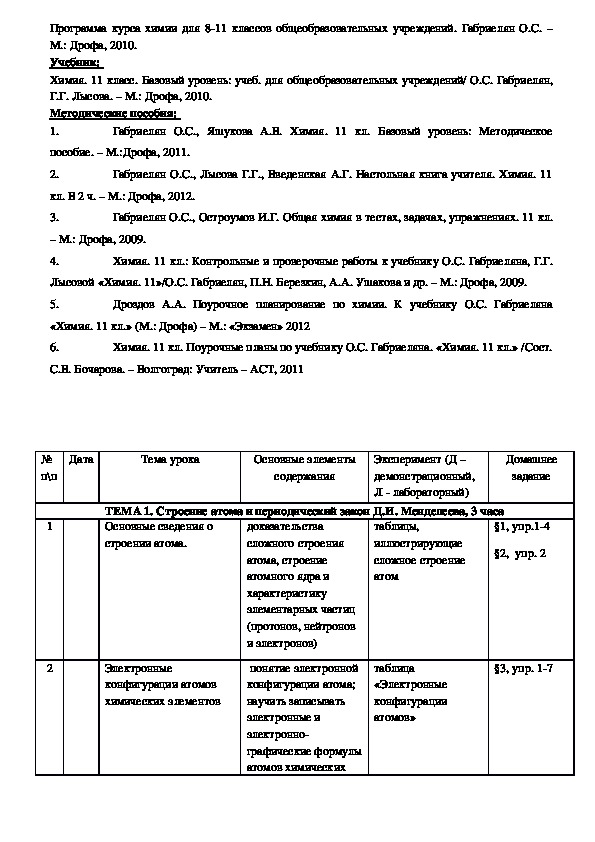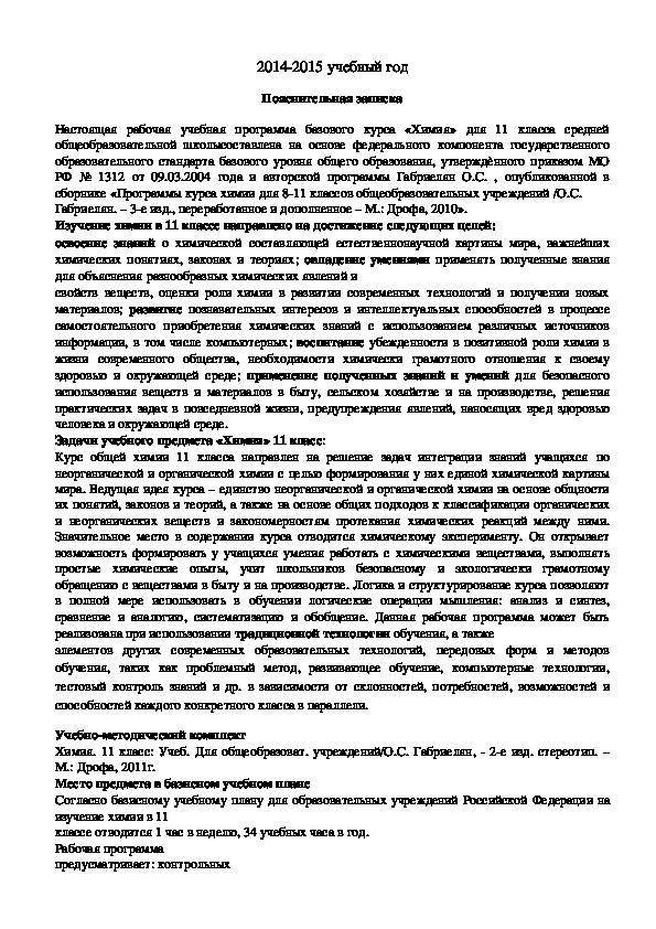 Габриелян. – 3-е изд., переработанное и дополненное – М.: Дрофа, 2010».Настоящая рабочая учебная программа базового курса «Химия» для 11 класса средней общеобразовательной школысоставлена на основе федерального компонента государственного образовательного стандарта базового уровня общего образования, утверждѐнного приказом МО РФ № 1312 от 09.03.2004 года и авторской программы Габриелян О.С. , опубликованной в сборнике «Программы курса химии для 8-11 классов общеобразовательных учреждений /О.С.