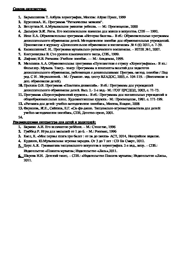 6. КалашниковаТ. И.. Программа музыкальноритмического воспитания. – ИГПК №1, 2007.