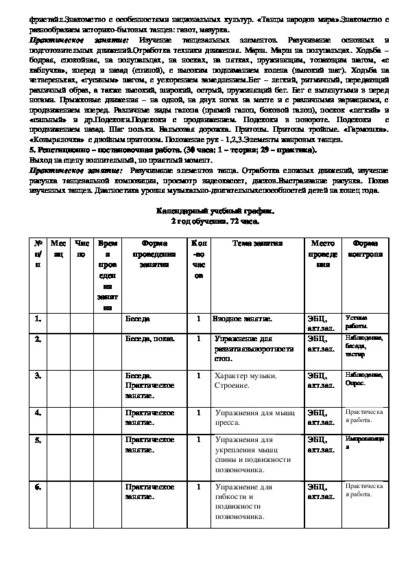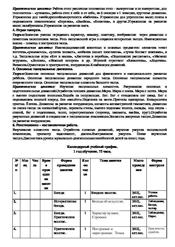 Программа содержит необходимую информацию для работы с дошкольниками по хореографии. Программу можно использовать и для детей начального звена. Данная программа рассчитана на два года обучения. В её содержании найдёте календарный - тематический график на год, поурочный график и диагностический материал.