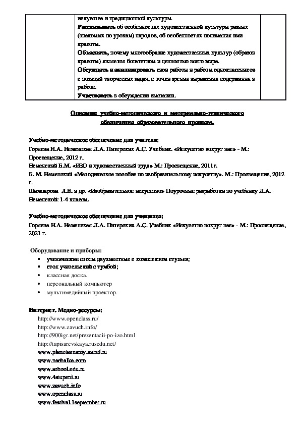 учреждений под редакцией Б.М. Неменского, В. Г. Гурова, Л. А. Неменской, УМК. «Школа