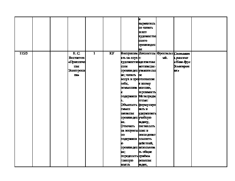 Материал содержит : оглавление, пояснительную записку,подробное календарно-тематическое планирование с прописанными УУД,учебно-тематический план,Содержание тем учебного курса ,Требования к уровню подготовки обучающихся,Перечень учебно- методического обеспечения,Материально- техническое и информационно- техническое обеспечение,Список литературы. Рабочая программа предмета «Литературное чтение» составлена на основе Федерального государственного стандарта начального общего образования (2010 года), Пример¬ной программы начального общего образования по литературному чтению для образовательных учреждений с русским языком обучения и программы общеобразовательных учреждений авторов Л.Ф. Климановой, В.Г. Горецкого, М.В. Головановой «Литературное чтение. 1-4 классы» (учебно-методический комплект «Школа России»).
