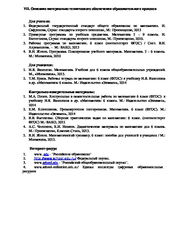 Рабочая программа реализуется по учебнику: Виленкин Н.Я. Математика. 6