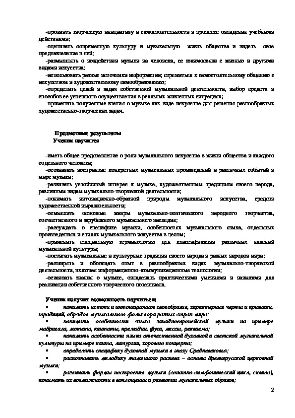 приобретать в процессе освоения учебного предмета «Музыка» формирование