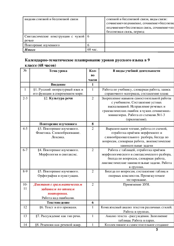языка в 9 классе отводится 68 часов (2 часа в неделю)