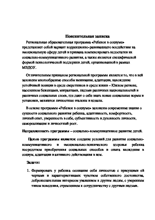 Региональная образовательная программа «Ребенок в социуме»