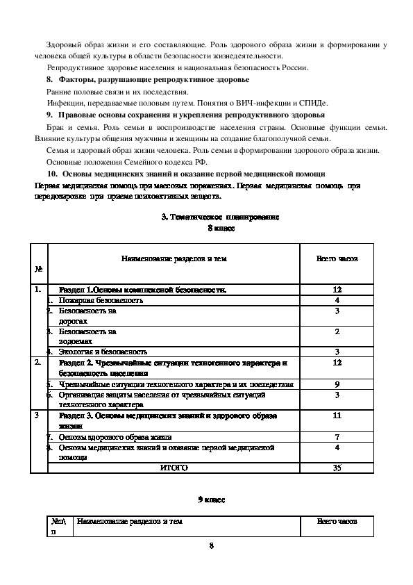 8 класс 35 ч (в год), 1 ч (в неделю)