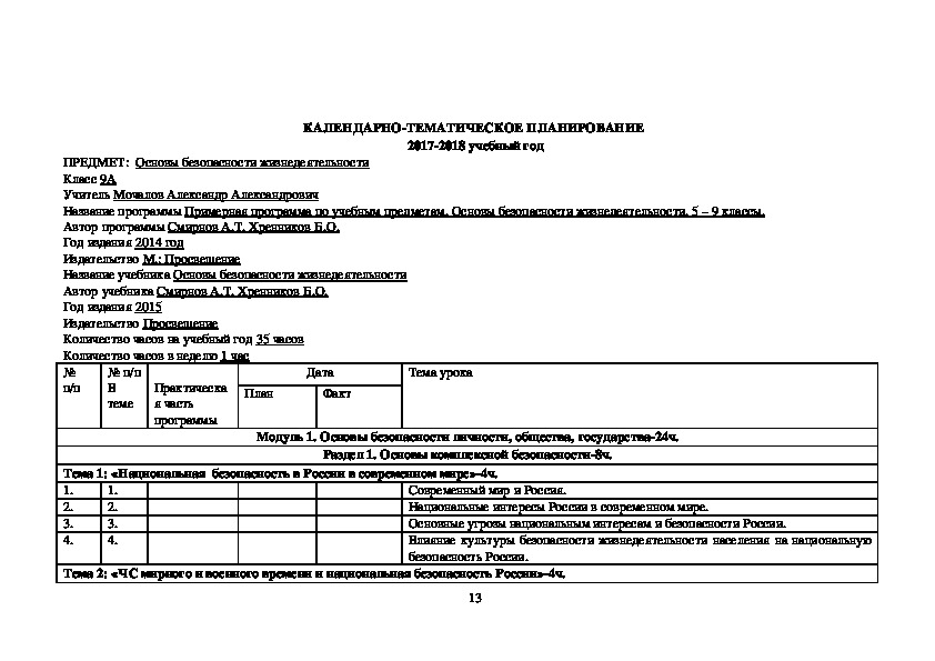 организаций: авторы учебника Смирнов А.Т. Хренников Б.О. М.: Просвещение, 2015