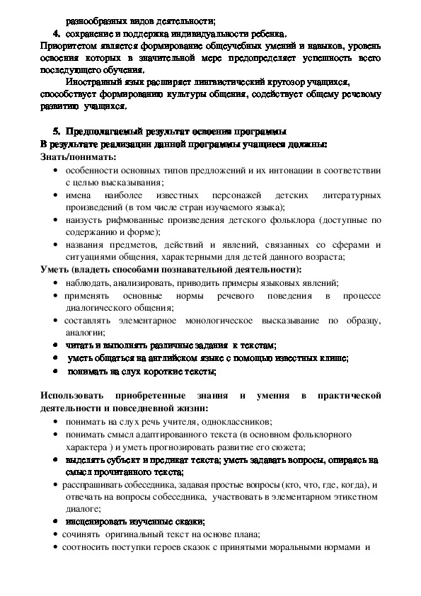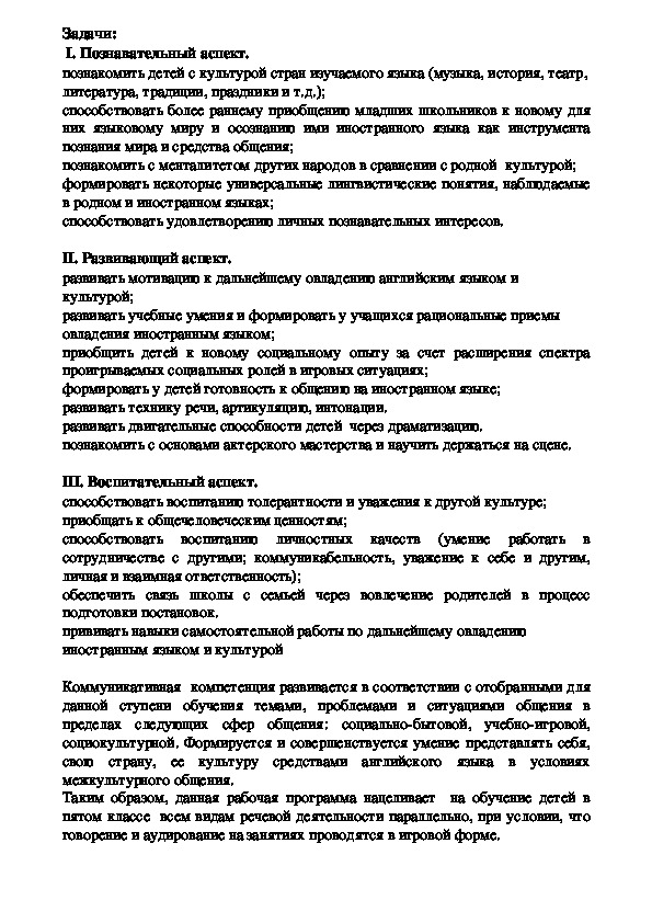 Рабочая программа по английскому языку для учащихся пятых классов