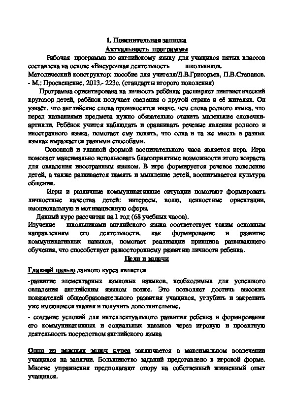 Программа предназначена для внеурочной работы по английскому языку, для учащихся 5 классов. Данная программа рассчитана на личность ребенка: ребенок получает сведения о другой стране и ее жителях, познает все в более простой и интересной форме, ребенок учится сравнивать и делать выводы.