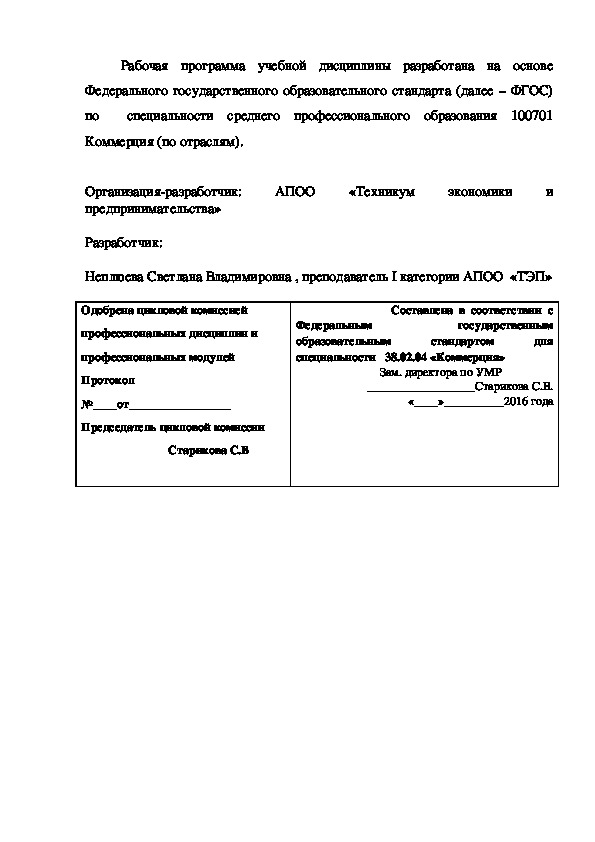 Рабочая программа учебной дисциплины может быть использована для специальностей НПО и СПО экономического профиля.Рабочая программа учебной дисциплины является частью основной профессиональной образовательной программы в соответствии с ФГОС по специальности СПО 38.02.04 Коммерция (по отраслям).