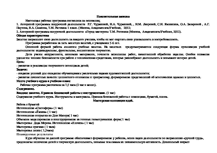 2. Авторской программы внеурочной деятельности «Город мастеров» Т.М. Рогозина (Москва, Академкнига/Учебник, 2012).