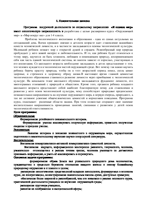 Программа внеурочной деятельности по социальному направлению «Я познаю мир»