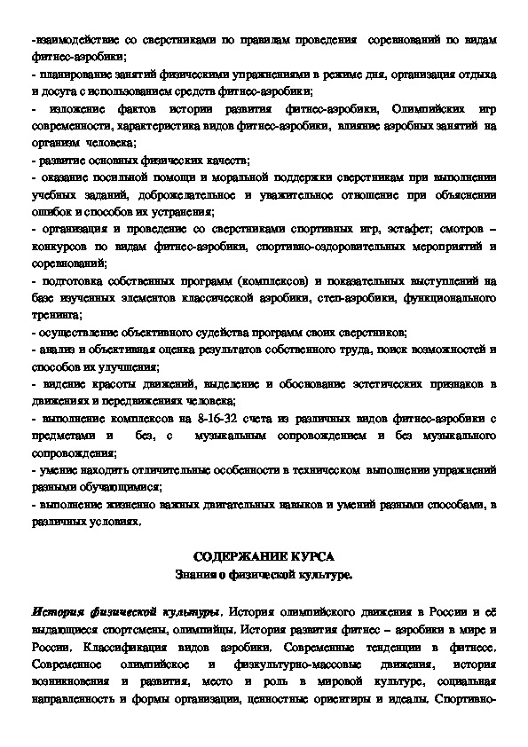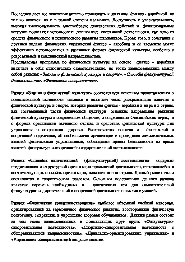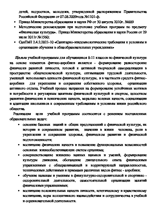 Программа по предмету "Физическая культура" на основе фитнес-аэробики для обучающихся 8-9 классов разработана в соответствии с требованиями Федерального государственного стандарта общего образования второго поколения и для обучающихся 10-11, которая соответствует федеральному компоненту государственного стандарта общего образования (Пр. №1089 Минобразования РФ от 5 марта 2004 года), отвечает положениям Закона "Об образовании" в части духовно-нравственного развития учащихся, основными положениями Концепции содержания образования школьников в области физической культуры (2001), Федерального закона «О физической культуре и спорте» от 4 декабря 2007г. №329-ФЗ, в котором отмечается, что организация физического воспитания в образовательных учреждениях включает в себя проведение