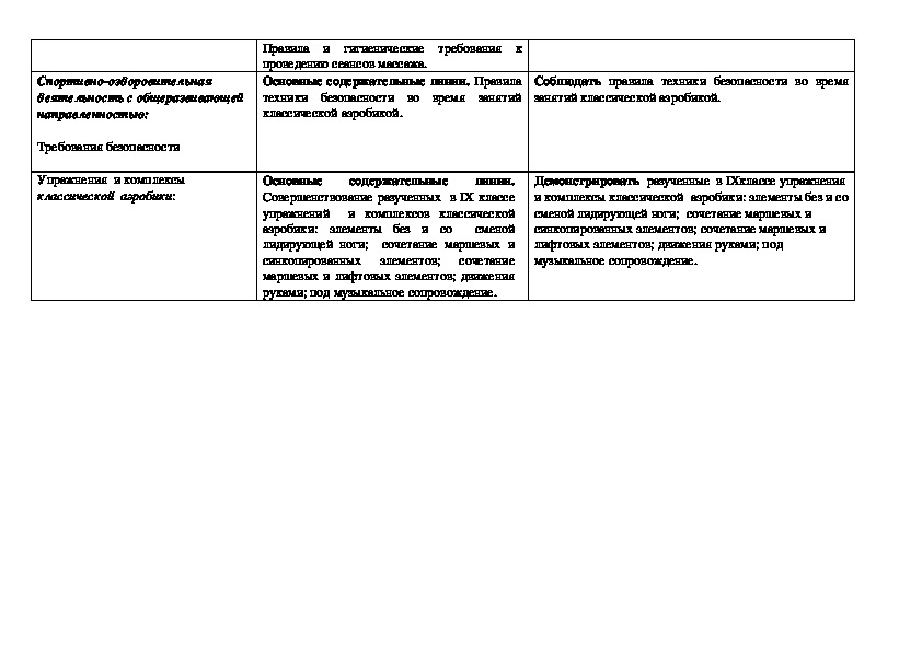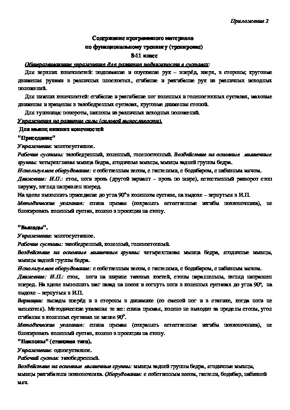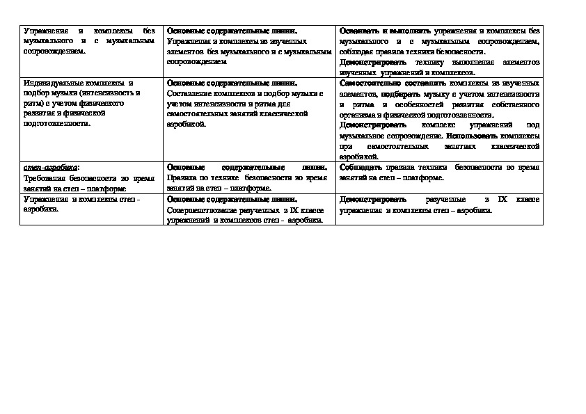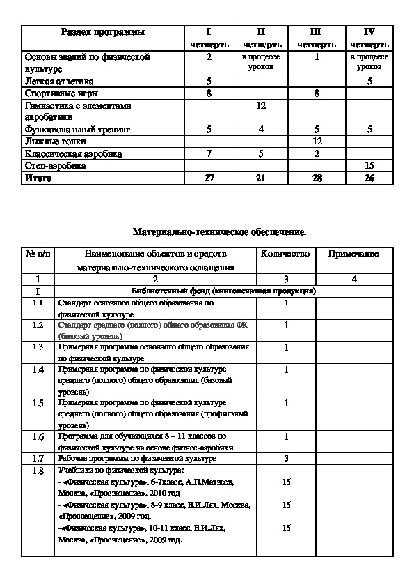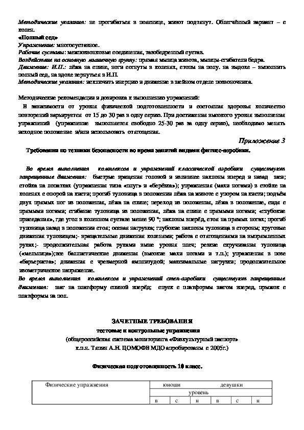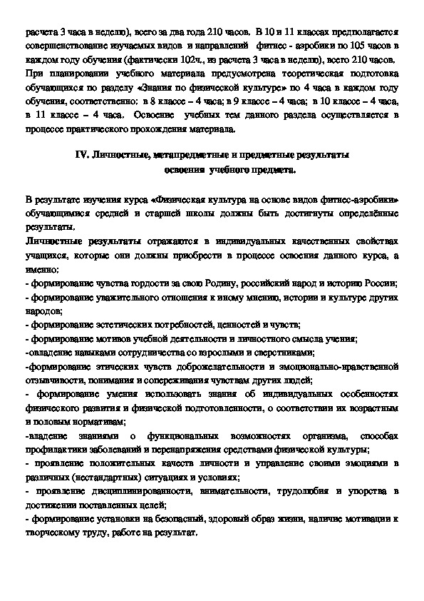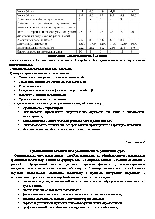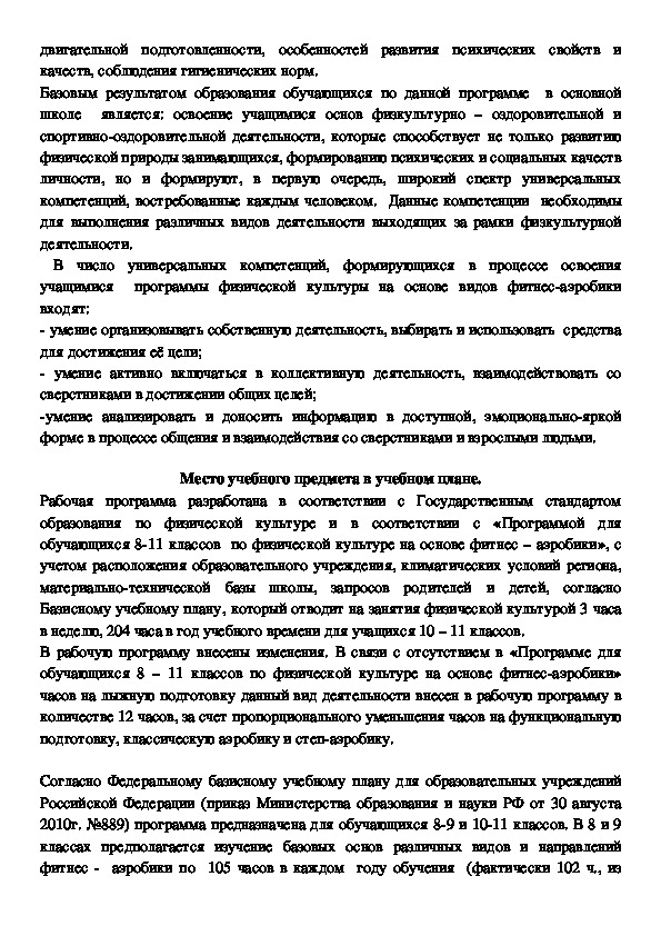 Программа по предмету "Физическая культура" на основе фитнес-аэробики для обучающихся 8-9 классов разработана в соответствии с требованиями Федерального государственного стандарта общего образования второго поколения и для обучающихся 10-11, которая соответствует федеральному компоненту государственного стандарта общего образования (Пр. №1089 Минобразования РФ от 5 марта 2004 года), отвечает положениям Закона "Об образовании" в части духовно-нравственного развития учащихся, основными положениями Концепции содержания образования школьников в области физической культуры (2001), Федерального закона «О физической культуре и спорте» от 4 декабря 2007г. №329-ФЗ, в котором отмечается, что организация физического воспитания в образовательных учреждениях включает в себя проведениеРабочая программа составлена на основе Государственного стандарта среднего (полного) образования по физической культуре в соответствии с апробируемой « Программой для обучающихся 8-11 классов по физической культуре на основе фитнес – аэробики»: