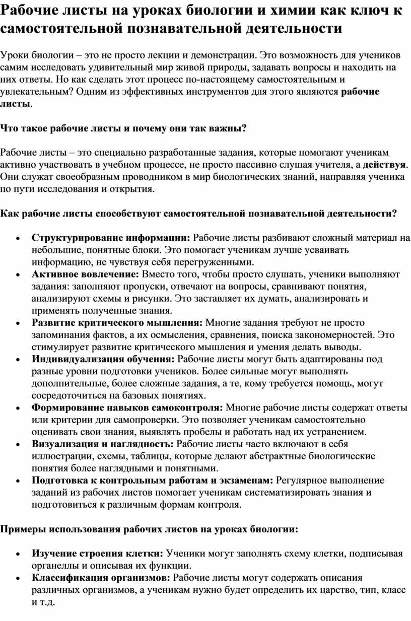 листы могут предлагать описание проведенного эксперимента и вопросы для