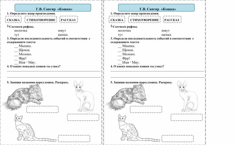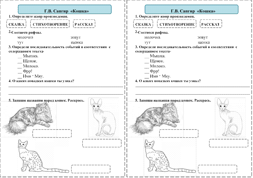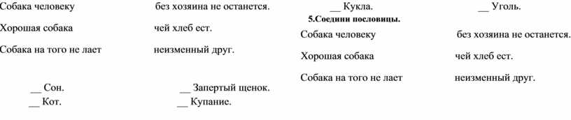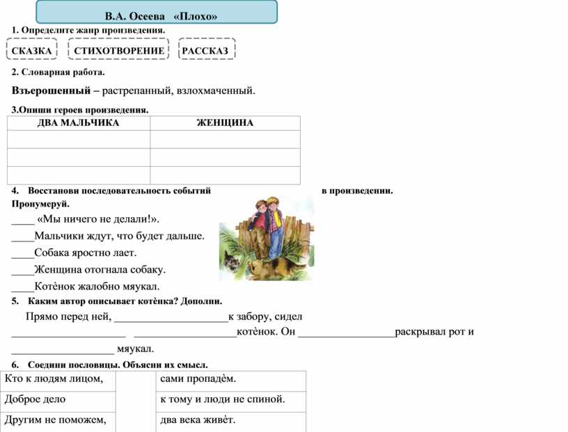 ____ «Мы ничего не делали!». ____Мальчики ждут, что будет дальше. ____Собака яростно лает. ____Женщина отогнала собаку. ____Котѐнок жалобно мяукал. 5. Каким автор описывает котѐнка? Дополни. Прямо перед ней, ____________________к забору, сидел ____________________ __________________котѐнок. Он _________________раскрывал рот и __________________ мяукал. 6. Соедини пословицы. Объясни их смысл.
