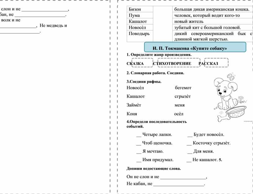 Новосѐл бегемот Кашалот сгрызѐт Займѐт меня Коня осѐл 4.Определи последовательность событий. __ Четыре лапки. __ Будет новосѐл. __ Чтоб щеночка. __ Косточку сгрызѐт. __ Я мечтаю. __ Для меня. __ Имя придумал. __ Не кашалот. 5. Допиши недостающие слова. Он не слон и не ___________________, Не кабан, не _____________________. Он не волк и не ____________________, Не медведь и не ___________________.