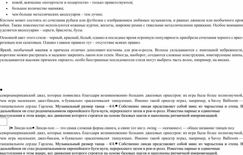 Танцевали, используя все движения свинговых танцев, но энергичнее и с большей долей импровизации. Для этого танца характерны очень сложные поддержки, прыжки, броски и некое небрежное отношение партнера к партнерше. Слоган рок-н-ролла звучал как «sex, drugs and rock-n-roll», поэтому из-за излишней откровенности и даже вульгарности этот вид танца считался аморальным. Но это не помешало ему оставаться сверхпопулярным в 20-х годах и даже в наше время. |