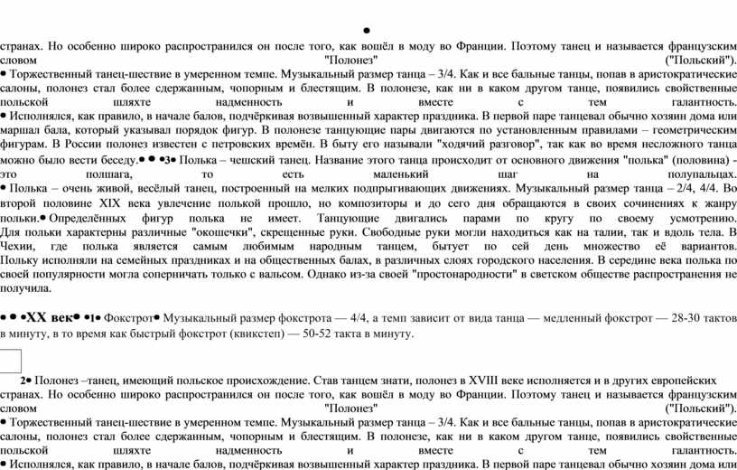 Полька – очень живой, весёлый танец, построенный на мелких подпрыгивающих движениях. Музыкальный размер танца – 2/4, 4/4. Во второй половине XIX века увлечение полькой прошло, но композиторы и до сего дня обращаются в своих сочинениях к жанру польки. |