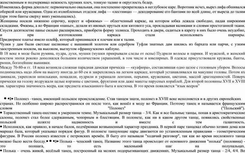 шелковые чулки, а буржуа — цветные. Женщины Женщина в костюме эпохи рококо напоминала изящную фарфоровую статуэтку. Силуэт костюма ярких и светлых тонов был очень женственным и подчеркивал нежность хрупких плеч, тонкую талию и округлость бедер. Изменилась форма декольте: первоначально овальная, она постепенно превратилась в неглубокое каре. Воротник исчез, вырез лифа обшивался оборкой или кружевами. Одна из излюбленных отделок лифа — «лестница» — декодирование его бантами по всей длине, от выреза до талии (при этом банты сверху вниз уменьшались). Женщины носили нижнюю сорочку, корсет и