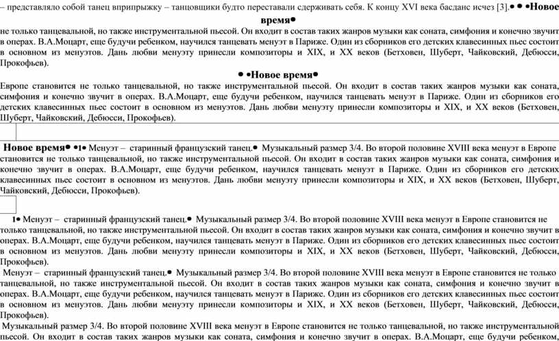 Музыкальный размер 3/4. Во второй половине XVIII века менуэт в Европе становится не только танцевальной, но также инструментальной пьесой. Он входит в состав таких жанров музыки как соната, симфония и конечно звучит в операх. В.А.Моцарт, еще будучи ребенком, научился танцевать менуэт в Париже. Один из сборников его детских клавесинных пьес состоит в основном из менуэтов. Дань любви менуэту принесли композиторы и XIX, и XX веков (Бетховен, Шуберт, Чайковский, Дебюсси, Прокофьев). В менуэте XIX века изменяются не только движения рук. Музыкальный размер, определяющий характер основного па менуэта, который в XVII веке занимал два полных такта по 3/4, стал занимать один такт [6]. |