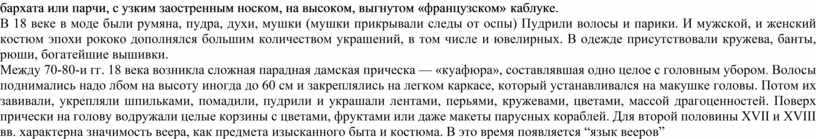 использовать шарниры. Чулки у дам были светлые шелковые с вышивкой золотом или серебром Туфли знатных дам шились из бархата или парчи, с узким заостренным носком, на высоком, выгнутом «французском» каблуке. В 18 веке в моде были румяна, пудра, духи, мушки (мушки прикрывали следы от оспы) Пудрили волосы и парики. И мужской, и женский костюм эпохи рококо дополнялся большим количеством украшений, в том числе и ювелирных. В одежде присутствовали кружева, банты, рюши, богатейшие вышивки. Между 70-80-и гг. 18 века возникла сложная парадная дамская прическа — «куафюра», составлявшая одно целое с головным убором. Волосы поднимались надо лбом на высоту иногда до 60 см и закреплялись на легком каркасе, который устанавливался на макушке головы. Потом их завивали, укрепляли шпильками, помадили, пудрили и украшали лентами, перьями, кружевами, цветами, массой драгоценностей. Поверх прически на голову водружали целые корзины с цветами, фруктами или даже макеты парусных кораблей. Для второй половины XVII и XVIII вв. характерна значимость веера, как предмета изысканного быта и костюма. В это время появляется “язык вееров”
