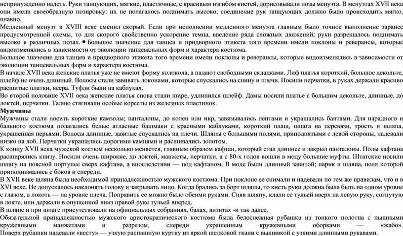 Большое значение для танцев и придворного этикета того времени имели поклоны и реверансы, которые видоизменялись в зависимости от эволюции танцевальных форм и характера костюма. В начале XVII века женские платья уже не имеют форму колокола, а падают свободными складками. Лиф платья короткий, большое декольте, шлейф не очень длинный. Волосы стали завивать локонами, которые спускались на спину и плечи. Носили перчатки, в руках держали красиво расшитые платки, веера. Туфли были на каблуках. Во второй половине XVII века женские платья снова стали шире, удлинился шлейф. Дамы носили платье с большим декольте, длинные, до локтей, перчатки. Талию стягивали особые корсеты из железных пластинок. Мужчины Мужчины стали носить короткие камзолы; панталоны, до колен или икр, завязывались лентами и украшались бантами. Для парадного и бального костюма полагались белые атласные башмаки с красными каблуками, короткий плащ, шпага на перевязи, трость и шляпа, украшенная перьями. Волосы длинные, завитые спускались на плечи. Шляпы с большими полями, приподнятыми с левой стороны, надевали низко на лоб. Перчатки украшались дорогими камнями и расшивались золотом. К концу XVII века мужской костюм несколько меняется, главным образом кафтан, который стал длиннее и закрыл панталоны. Полы кафтана расширялись книзу. Носили очень широкие, до локтей, манжеты, перчатки, а с 80-х годов вошли в моду большие муфты. Штатские носили шпагу на поясной портупее сверх кафтана, а впоследствии — под кафтаном. В моде были длинный завитой; парик и шляпа, поля которой приподнимались с боков и спереди. В XVII веке шляпа была необходимой принадлежностью мужского костюма. При поклоне ее снимали и надевали по тем же правилам, что и в XVI веке. Не допускалось наклонять голову и закрывать лицо. Когда брались за борт шляпы, то кисть руки должна была быть на одном уровне с глазом, а локоть — на уровне плеча. Поправить ее можно было обеими руками. Сняв шляпу, клали ее тульей вверх на левую руку, согнутую в локте, или держали в опущенной вниз правой руке тульей вперед. В шляпе и при шпаге присутствовали на официальных собраниях, балах, визитах -и так далее. Обязательной принадлежностью мужского