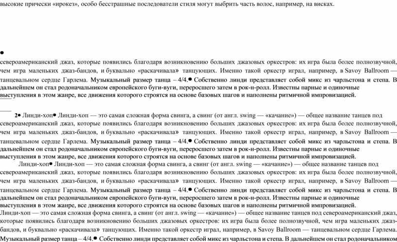 Линди-хоп — это самая сложная форма свинга, а свинг (от англ. swing — «качание») — общее название танцев под североамериканский джаз, которые появились благодаря возникновению больших джазовых оркестров: их игра была более полнозвучной, чем игра маленьких джаз-бандов, и буквально «раскачивала» танцующих. Именно такой оркестр играл, например, в Savoy Ballroоm — танцевальном сердце Гарлема. Музыкальный размер танца – 4/4. |