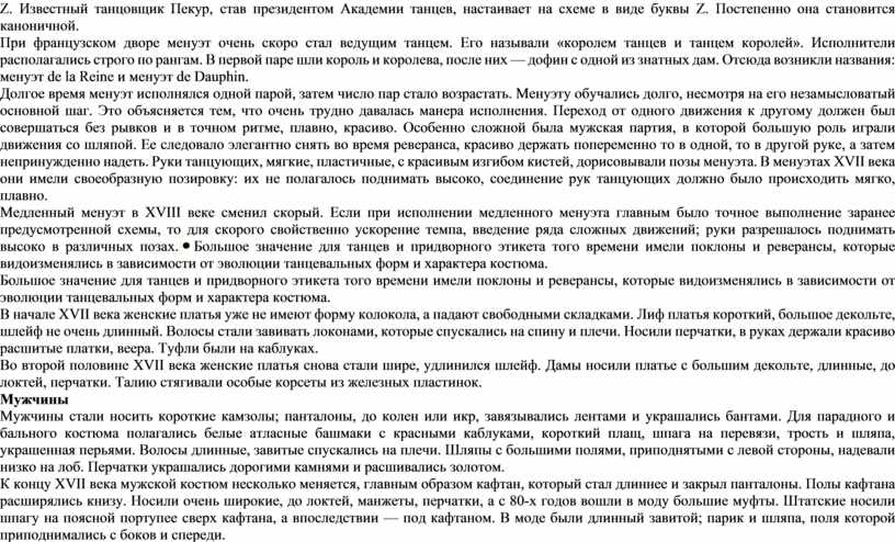В XVII веке король Людовик XIV открыл моду на этот танец, продержавшийся в музыке несколько столетий. Существовали менуэт Короля, менуэт Королевы и менуэт двора. Пластика танца: поклоны, грациозные жесты и плавные приседания. Умение танцевать считалось неотъемлемой частью хорошего воспитания дворянских детей. Но танцевальные движения были так замысловаты, что проходили не дни, а годы прежде чем аристократы решались танцевать менуэт на придворном балу. Исполнители менуэта двигались по определенной схеме, придерживаясь строгого композиционного рисунка. Схем существовало много, хотя между ними нетрудно найти общие черты. Президент Парижской Академии танца Луи Бошан — учитель Людовика XIV — предложил схему в виде буквы S. Тауберт в своем труде описывает схемы в виде восьмерки, двойки, букв S и Z. Известный танцовщик Пекур, став президентом Академии танцев, настаивает на схеме в виде буквы Z. Постепенно она становится каноничной. При французском дворе менуэт очень скоро стал ведущим танцем. Его называли «королем танцев и танцем королей». Исполнители располагались строго по рангам. В первой паре шли король и королева, после них — дофин с одной из знатных дам. Отсюда возникли названия: менуэт de la Reine и менуэт de Dauphin. Долгое время менуэт исполнялся одной парой, затем число пар стало возрастать. Менуэту обучались долго, несмотря на его незамысловатый основной шаг. Это объясняется тем, что очень трудно давалась манера исполнения. Переход от одного движения к другому должен был совершаться без рывков и в точном ритме, плавно, красиво. Особенно сложной была мужская партия, в которой большую роль играли движения со шляпой. Ее следовало элегантно снять во время реверанса, красиво держать попеременно то в одной, то в другой руке, а затем непринужденно надеть. Руки танцующих, мягкие, пластичные, с красивым изгибом кистей, дорисовывали позы менуэта. В менуэтах XVII века они имели своеобразную позировку: их не полагалось поднимать высоко, соединение рук танцующих должно было происходить мягко, плавно. Медленный менуэт в XVIII веке сменил скорый. Если при исполнении медленного менуэта главным было точное выполнение заранее предусмотренной схемы, то для скорого свойственно ускорение темпа, введение ряда сложных движений; руки разрешалось поднимать высоко в различных позах. |