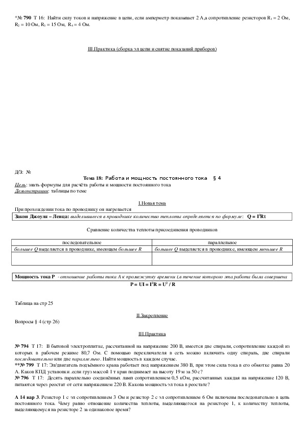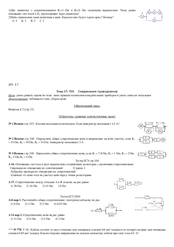 № 796 Т 17: Десять параллельно соединённых ламп сопротивлением 0,5 кОм, рассчитанных каждая на напряжение 120 В,