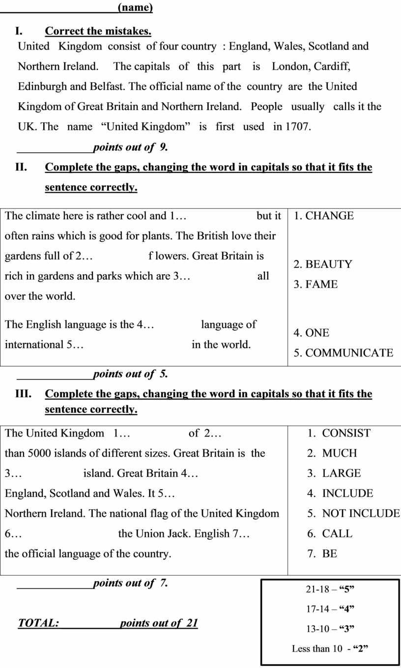 The United Kingdom 1… of 2… than 5000 islands of different sizes. Great Britain is the 3… island. Great Britain 4… England, Scotland and Wales. It 5… Northern Ireland. The national flag of the United Kingdom 6… the Union Jack. English 7… the official language of the country. |