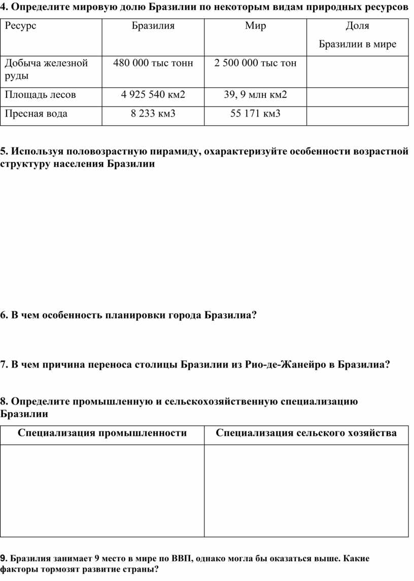 4. Определите мировую долю Бразилии по некоторым видам природных ресурсов