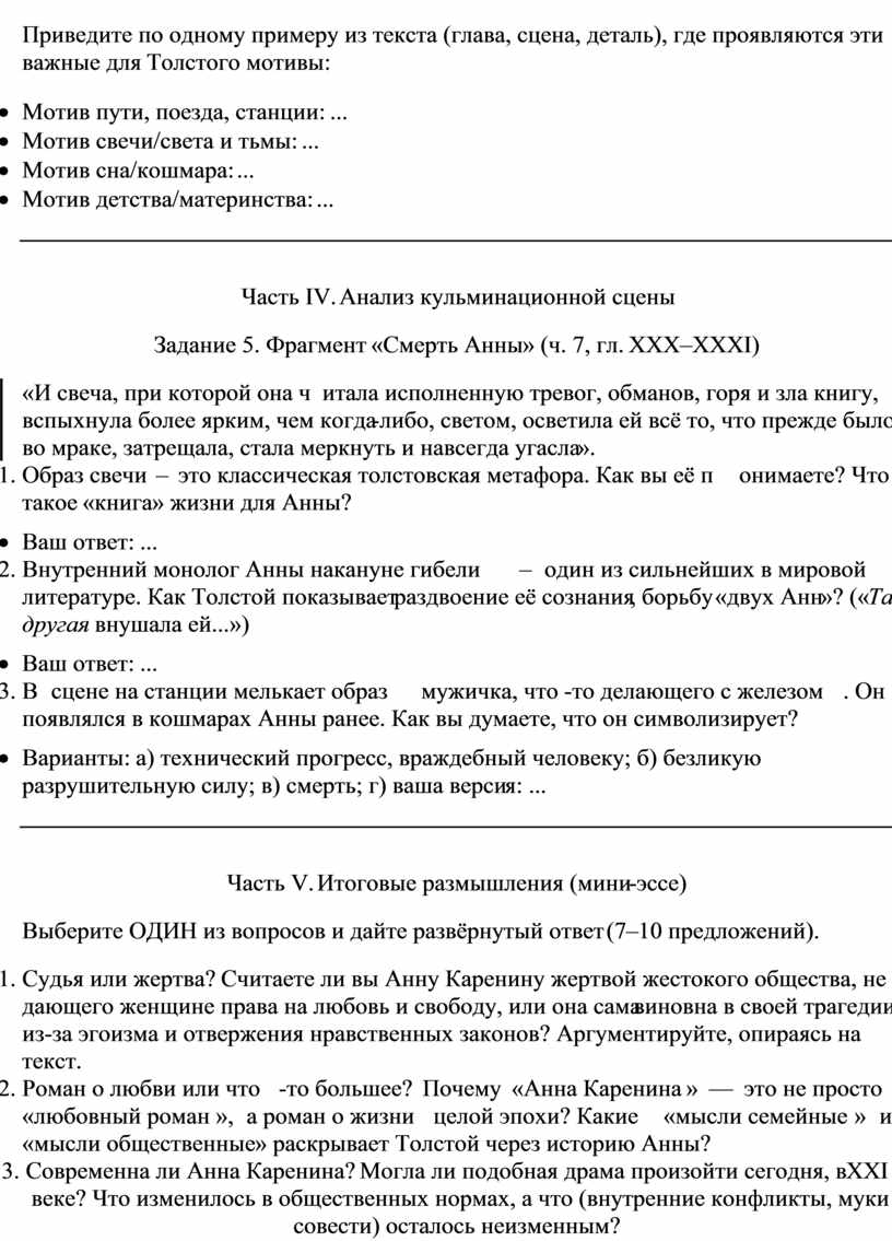 1. Судья или жертва? Считаете ли вы Анну Каренину жертвой жестокого общества, не дающего женщине права на любовь и свободу, или она сама виновна в своей трагедии из-за эгоизма и отвержения нравственных законов? Аргументируйте, опираясь на текст.