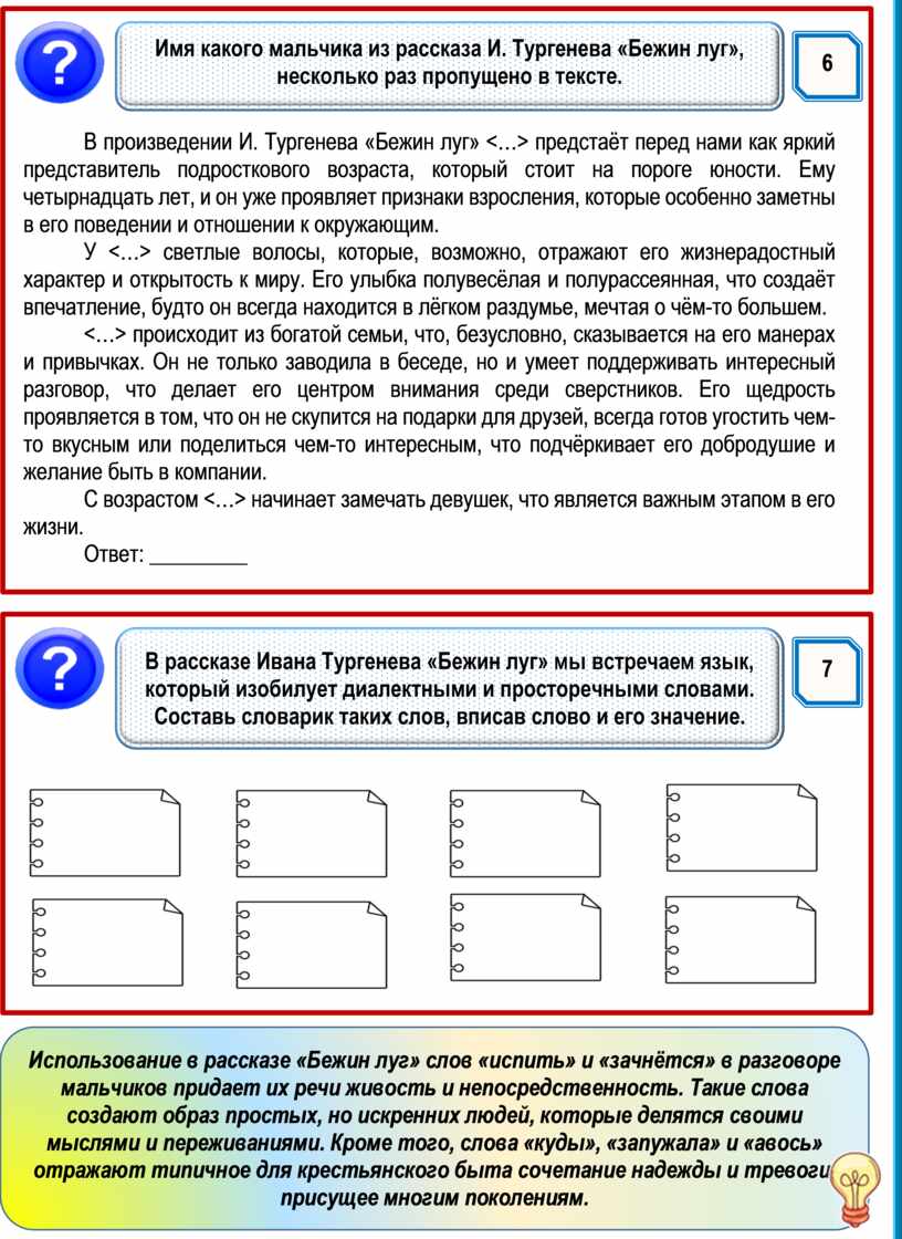 В помощь учителю. Диалектные слова, такие как «откентелева» (что означает «откуда»), «на поди» и «напредки» (что переводится как «наперёд» или «сначала»), создают ощущение местного колорита. Они характерны именно для данной местности и позволяют читателю почувствовать, как живут и разговаривают люди в деревне. Кроме того, в речи мальчиков мы встречаем просторечные выражения, которые часто употребляются необразованными слоями населения. Например, слова «хоша» (что означает «хоть»), «перетрусился», «эвто» (то есть "это") и «слышь» (что можно перевести как «слышишь») подчеркивают не только уровень образования, но и общую атмосферу непринужденного общения. Просторечные выражения, такие как «светопреставление», «штц» (что означает «щи»), а также слова «хрестьяне» и «хрестиянский» (которые обозначают «христиане» и «крестьяне» соответственно), показывают, как язык может изменяться в зависимости от социального контекста. |