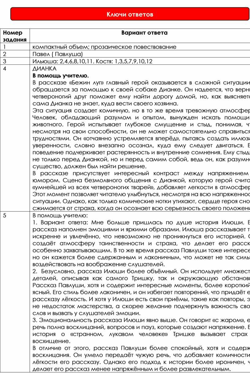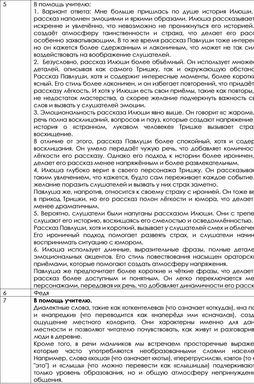 В помощь учителю: 1. Вариант ответа: Мне больше пришлась по душе история Илюши. Его рассказ наполнен эмоциями и яркими образами. Илюша рассказывает так искренне и увлечённо, что невозможно не проникнуться его историей. Он создаёт атмосферу таинственности и страха, что делает его рассказ особенно захватывающим. В то же время рассказ Павлуши тоже интересен, но он кажется более сдержанным и лаконичным, что может не так сильно воздействовать на воображение слушателей. 2. Безусловно, рассказ Илюши более объёмный. Он использует множество деталей, описывая как самого Тришку, так и окружающую обстановку. Рассказ Павлуши, хотя и содержит интересные моменты, более короткий и ясный. Его стиль более лаконичен, и он избегает повторений, что придаёт его рассказу лёгкость. И хотя у Илюши есть свои приёмы, такие как повторы, это не недостаток мастерства, а скорее желание подчеркнуть важность своих слов и вызвать у слушателей эмоции. 3. Эмоциональность рассказа Илюши явно выше. Он говорит «с жаром», его речь полна восклицаний, вопросов и пауз, которые создают напряжение. Его история о «странном, лукавом человеке» Тришке вызывает страх и восхищение. В отличие от этого, рассказ Павлуши более спокойный, хотя и содержит восклицания. Он умело передаёт чужую речь, что добавляет комичности и лёгкости его рассказу. Однако его подход к истории более ироничен, что делает его рассказ менее напряжённым и более развлекательным. 4. Илюша глубоко верит в своего персонажа Тришку. Он рассказывает с таким увлечением, что кажется, будто сам переживает каждое событие. Его желание поразить слушателей и вызвать у них страх заметно. Павлуша же, напротив, относится к своему страху с иронией. Он тоже верит в приход Тришки, но его рассказ полон лёгкости и юмора, что делает его менее драматичным. 5. Вероятно, слушатели были напуганы рассказом Илюши. Они с трепетом слушают его историю, восхищаясь его смелостью и осведомлённостью. Рассказ Павлуши, хотя и короткий, вызывает у слушателей смех и облегчение. Его ироничный подход помогает развеять страх, и слушатели начинают воспринимать ситуацию с юмором. 6. Илюша использует длинные, выразительные фразы, полные деталей и эмоциональных акцентов. Его стиль повествования насыщен ораторскими приёмами, которые помогают создать атмосферу напряжения. Павлуша же предпочитает более короткие и чёткие фразы, что делает его рассказ более доступным и понятным. Он легко переключается между персонажами, передавая их речь, что добавляет динамичности его рассказу. |