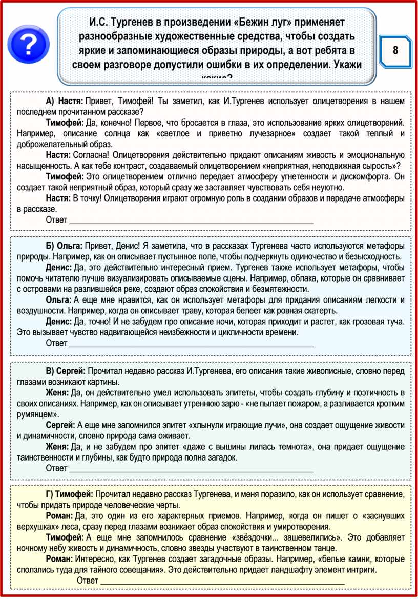 А) В диалоге приводятся примеры не олицетворения, а эпитетов. Б) В диалоге примеры не метафор, а сравнения. В) В диалоге примеры не эпитетов, а метафор. Г) В диалоге примеры не сравнений, а олицетворений. |