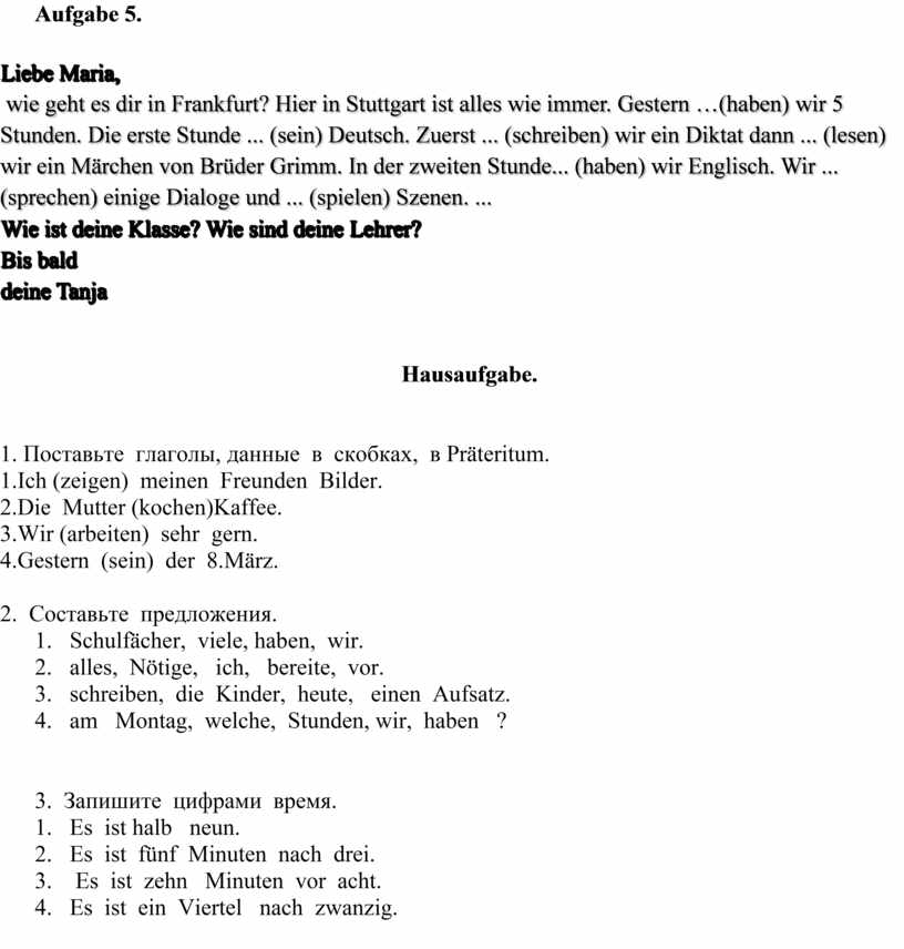 wie geht es dir in Frankfurt? Hier in Stuttgart ist alles wie immer. Gestern …(haben) wir 5 Stunden. Die erste Stunde ... (sein) Deutsch. Zuerst ... (schreiben) wir ein Diktat dann ... (lesen) wir ein Märchen von Brüder Grimm. In der zweiten Stunde... (haben) wir Englisch. Wir ... (sprechen) einige Dialoge und ... (spielen) Szenen. ...