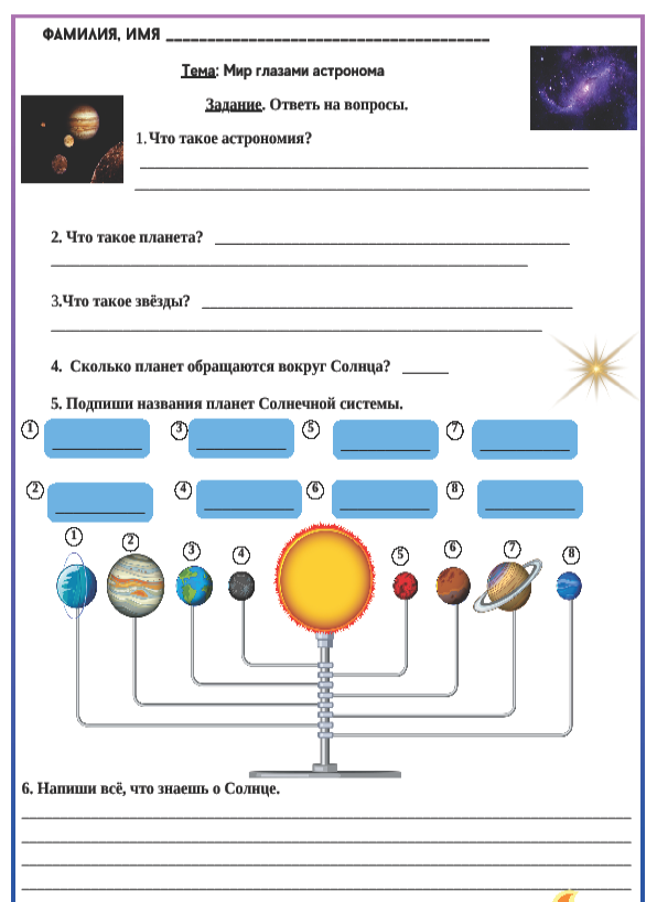 Рабочий лист к уроку окружающего мира по теме "Мир глазами астронома", 4 класс, УМК "Школа России"