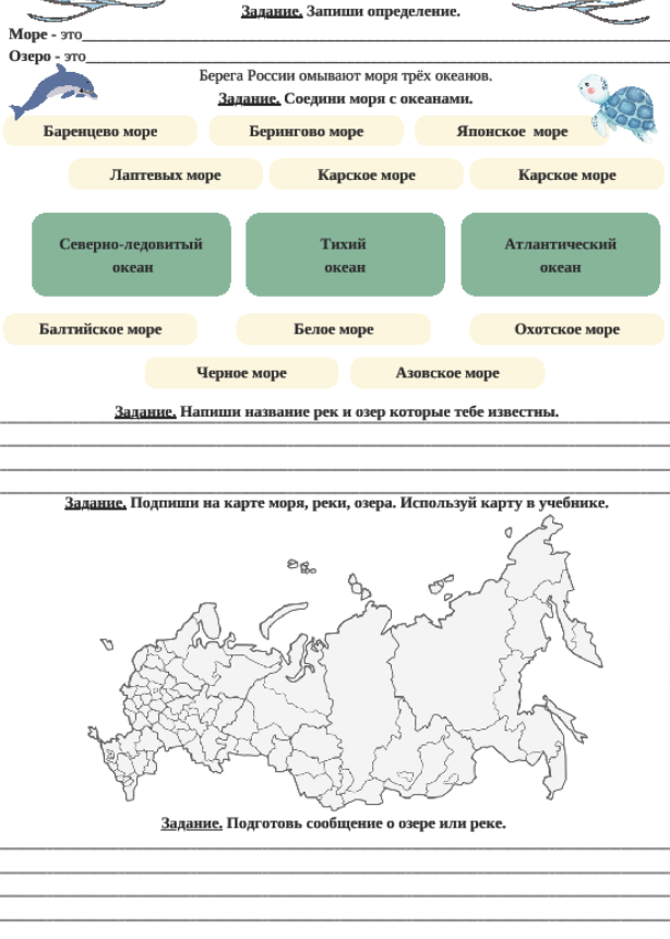 Рабочий лист к уроку окружающего мира по теме "Моря, озера и Реки России", 4 класс, УМК "Школа России"